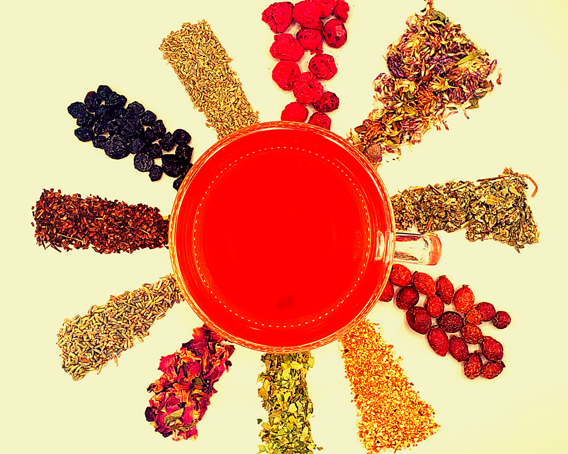 Red raspberry leaf, Moringa leaf, Rooibos, Red clover blossoms, Anise seeds, Rose hips, Blueberries, Raspberries, Rosebuds, Lavender seeds, Tangerine peel